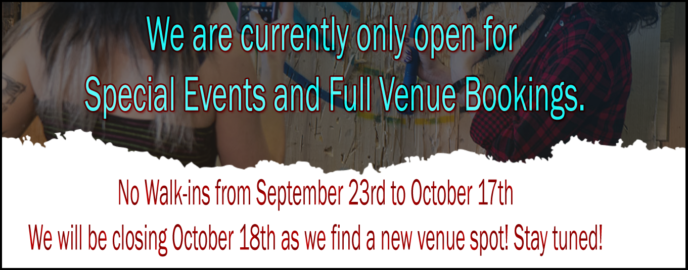 Special Event bookings and Full Venue bookings can be made outside of these hours. Please contact us at contact@urbanaxe.ca